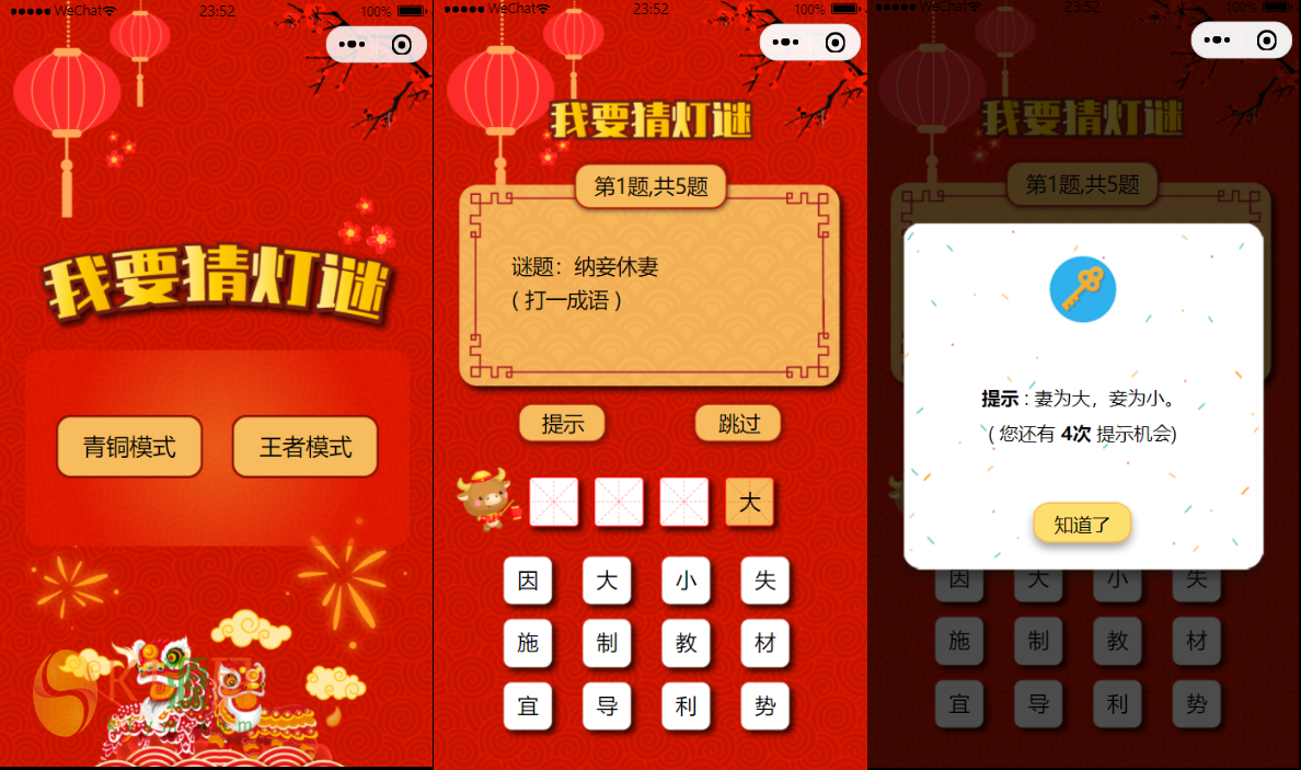 猜灯谜小程序分两种模式青铜模式(普通)和王者模式(困难),另外猜题里面还支持答案提示,当然是有次数限制的。