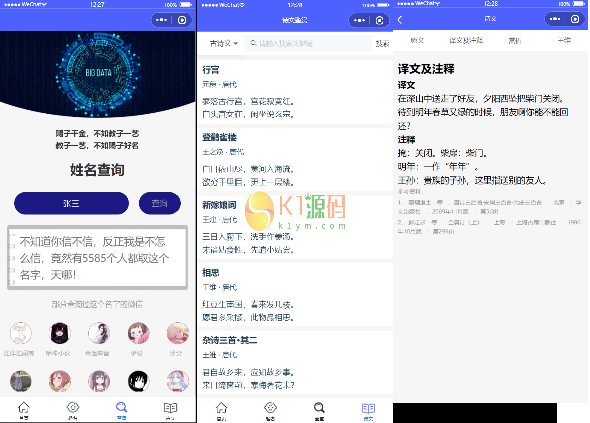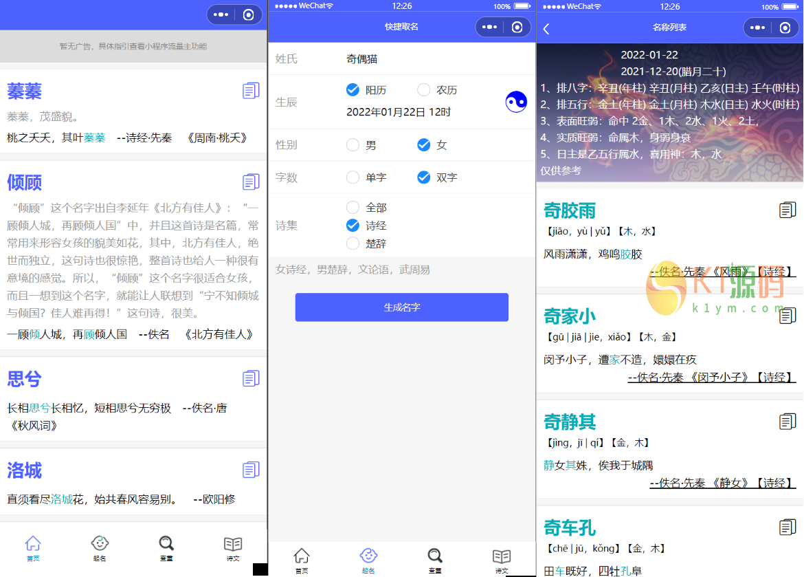 这是一个实用需求量还是比较高的一款微信小程序源码 由多个功能组合而成,具体如下 名字来源查询 取名工具(支持多种选择取名) 查询重复名(输入名字查询有多少人和你吃饭) 诗文(里面就是一些古诗啥的展示) 另外小编也给加了一些流量主进去,以方便大家运营! 声明:本站所有文章,如无特殊说明或标注,均为本站原创发布。任何个人或组织,在未征得本站同意时,禁止复制、盗用、采集、发布本站内容到任何网站、书籍等各类媒体平台。如若本站内容侵犯了原著者的合法权益,可联系我们进行处理。