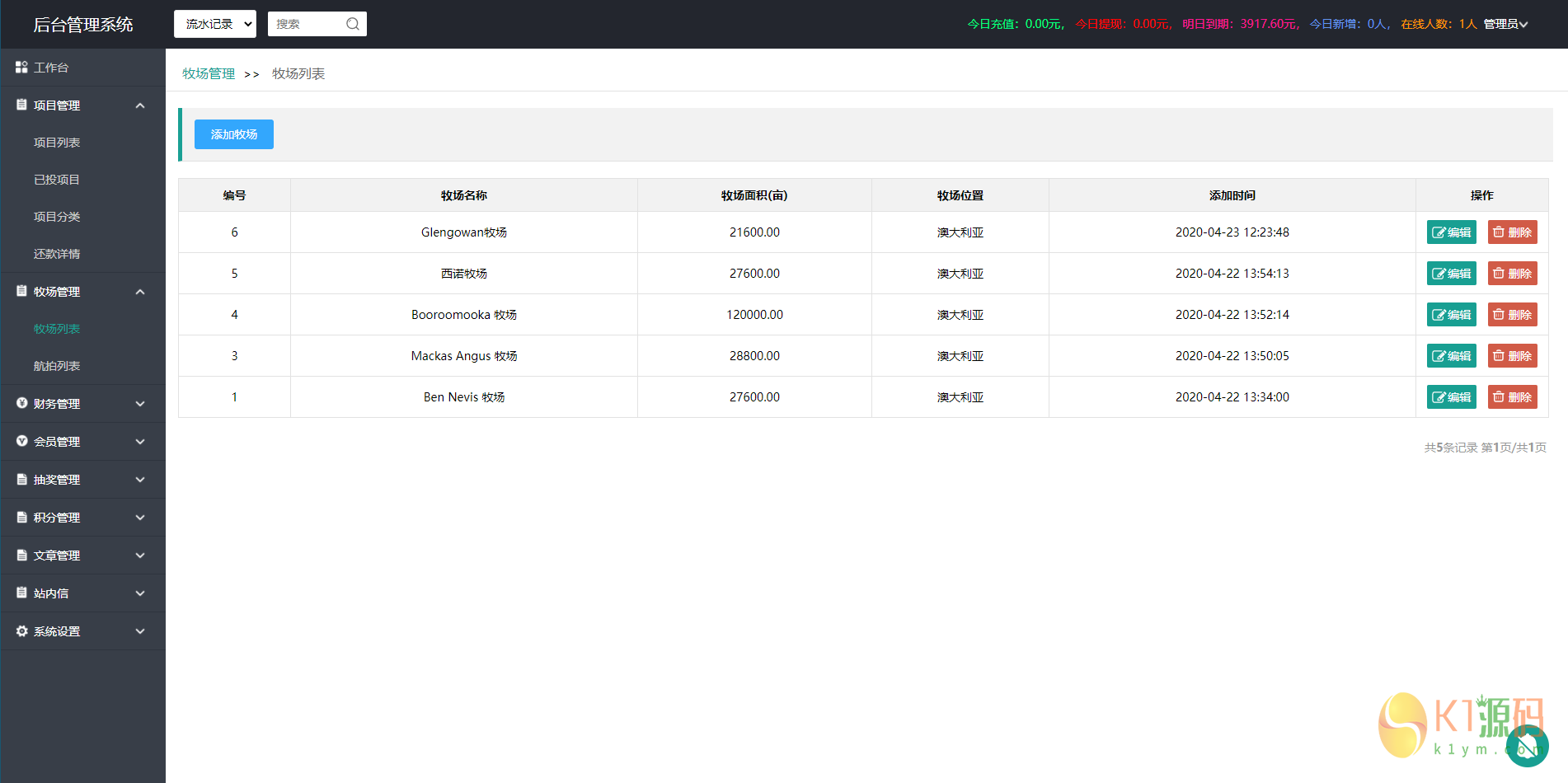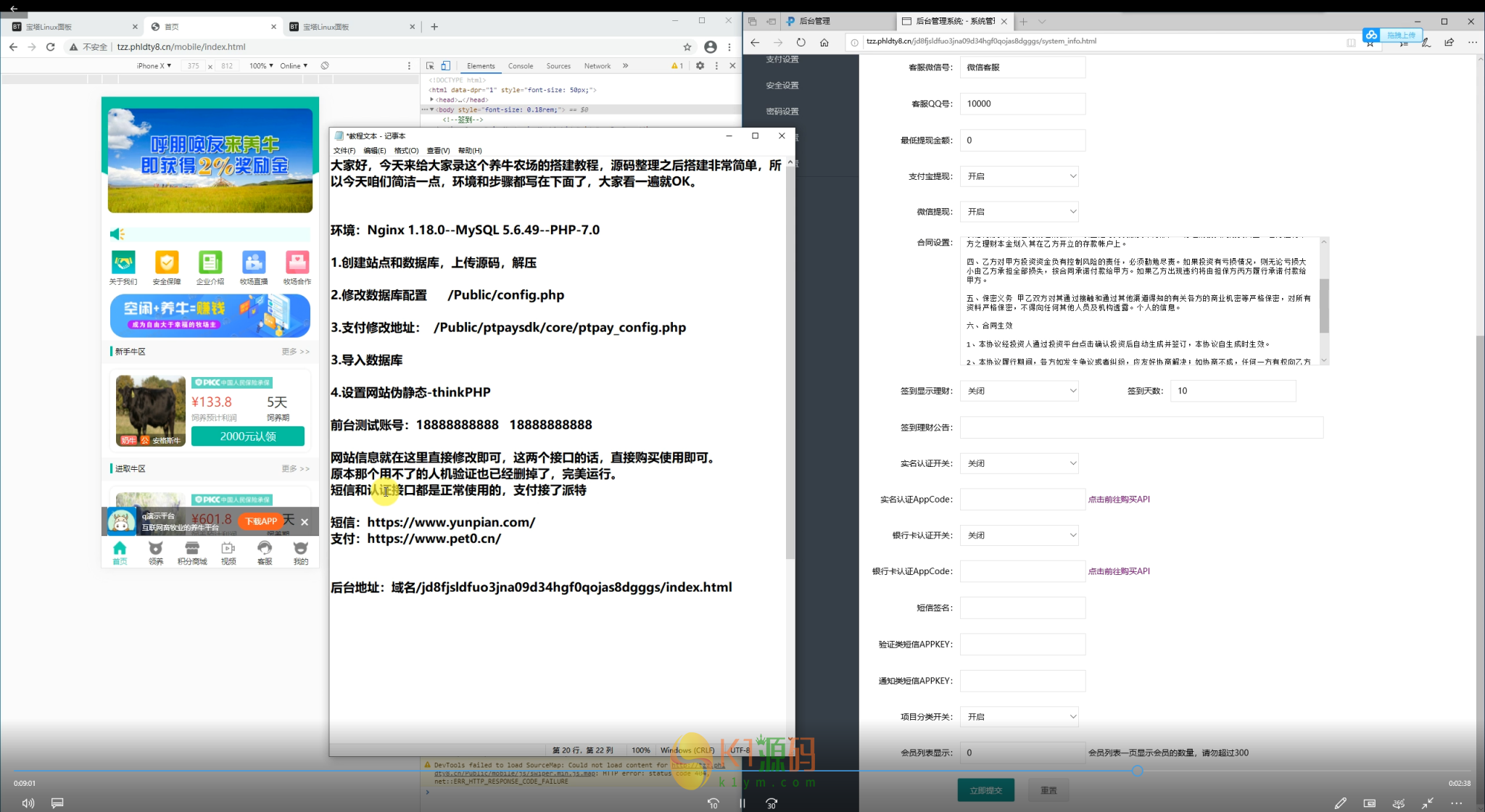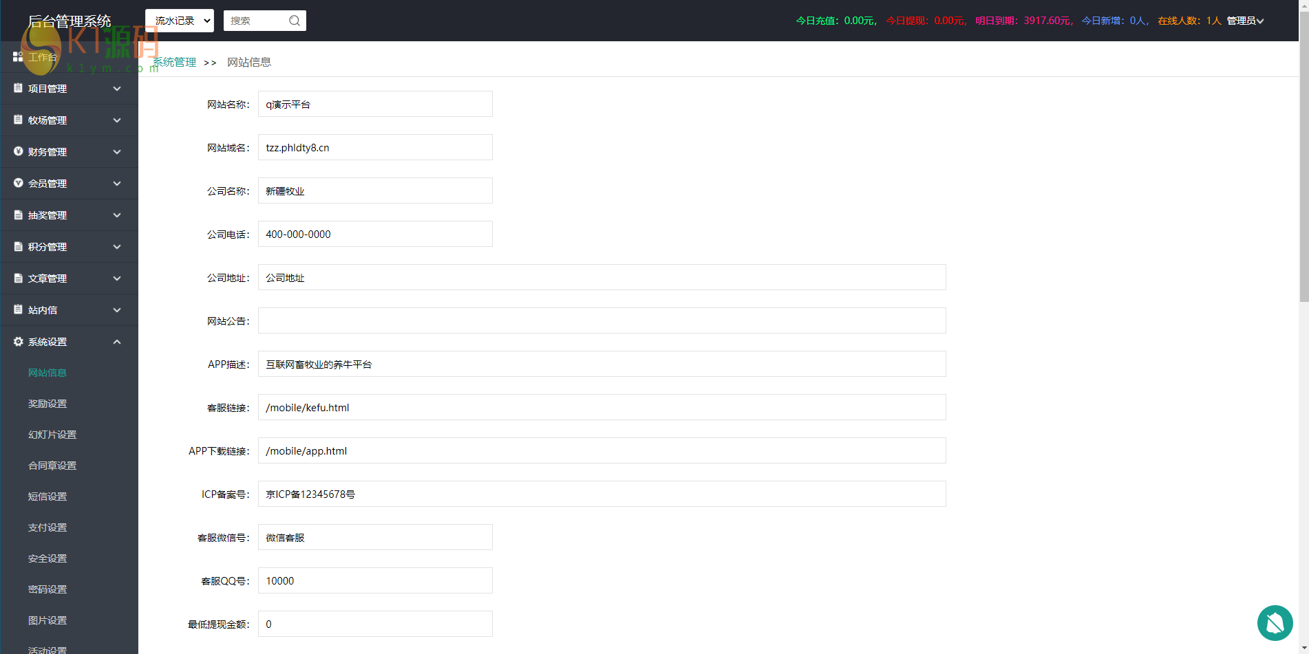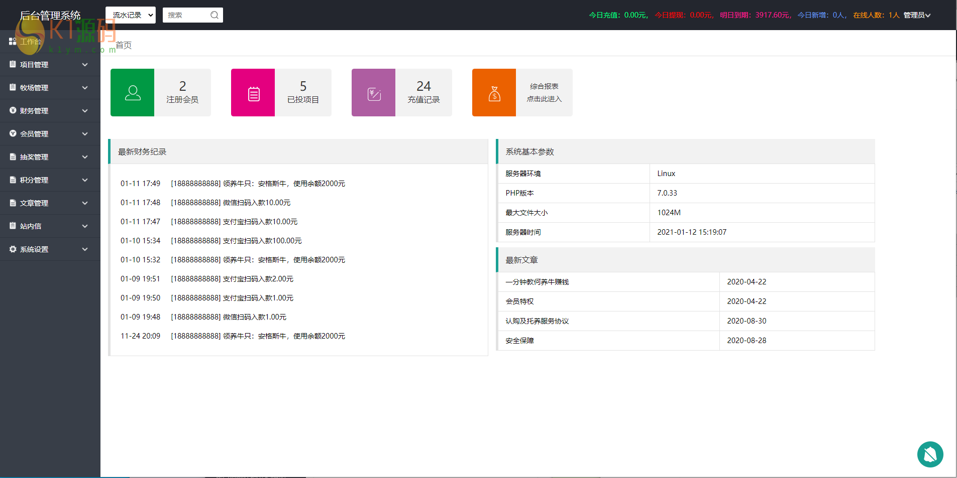 好友分享的,已经全部整理修复完毕,之前总是掉链子的人机验证也已经删掉了,资金明细、收益明细等等都非常清楚,自带的签到、推广、转盘抽奖、积分商城也都非常好用,实名认证和银行卡认证已经对接了专业的api接口,在后台填写调用即可。支付接入派特个人免签,微信支付宝双通道,短信和支付的地址都写在教程里了。东西如下图所示: