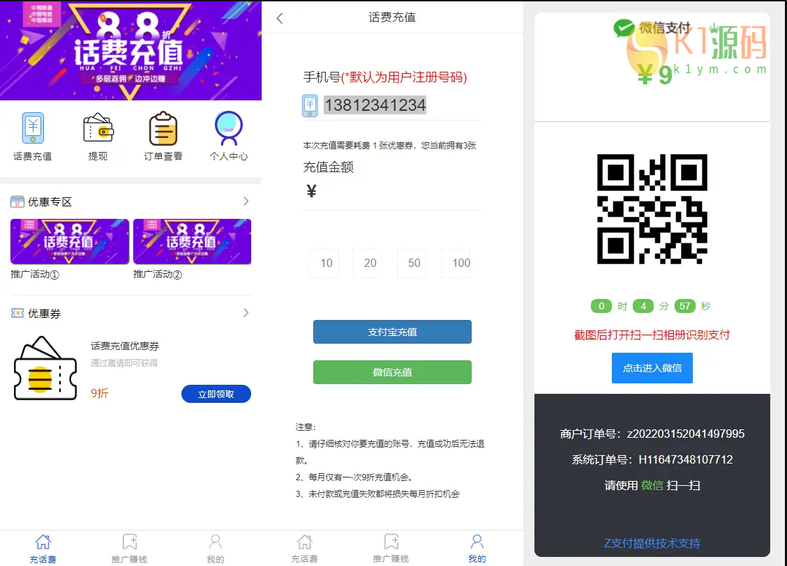 这是套话费充值的PHP网站源码,非常完整,我到手之后修复了充值时金额显示错误的问题,充值对接了Z支付的免签接口。可以设置九折优惠券吸引流量,支持限制每月充值次数,本来是默认限制每月一次的,我把限制取消了,限制的方法备注在里面。文本教程里也非常详细的指出了,短信API对接的是短信宝,就没有改动。这个就不上图了,有用处的自己下载搭建就行,都整理过了。