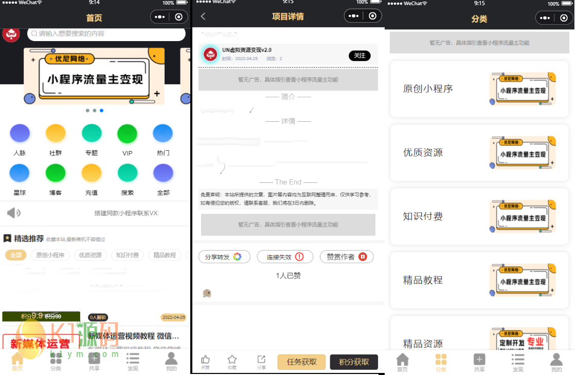适合任何类型的资源分享,手机软件、图片素材、行业文档等等,你的任何互眹网资源都可以套用到本小程序,类型就是你的分享资源类型,小程序是个百搭的框架
