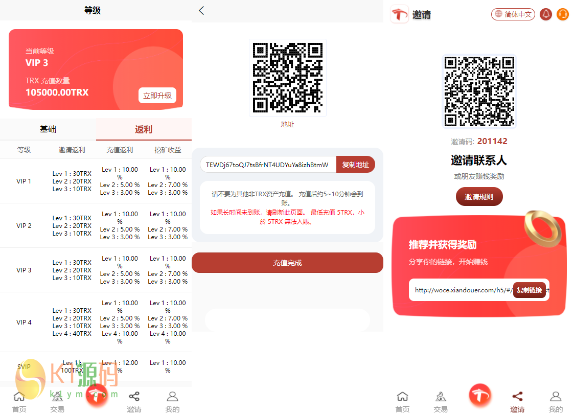 5. 邀请。用户可以通过二维码或者邀请链接推广注册,通过这个邀请链接注册的用户,都会在你的下级,客户通过你的邀请链接注册后你可以得到佣金,之后下级用户充值或者获取收益你都会有返佣