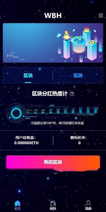 所有参与者进出完全用ETH,进场是按区块来计算盈利【2个ETH为一个区块】每个区块进场必须按照区块价值5%的比例来销毁平台币WBH1。
