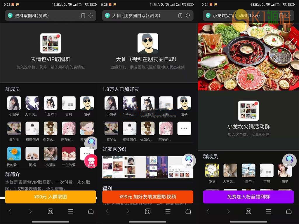 相信各位既然看到了这篇文章,就知道这个是干什么的了,就拿最近很火的表情包举例,最早一批吃肉的听说已经转了几百万了,变现就是通过用户取图,付 费进群,例如付9.9进群 d音的流量超乎你想想,一个1w点赞量的视频,可能几十甚至上百万的播放量视频主发一条视频,如果爆了,可能带来几万个付 费用户。