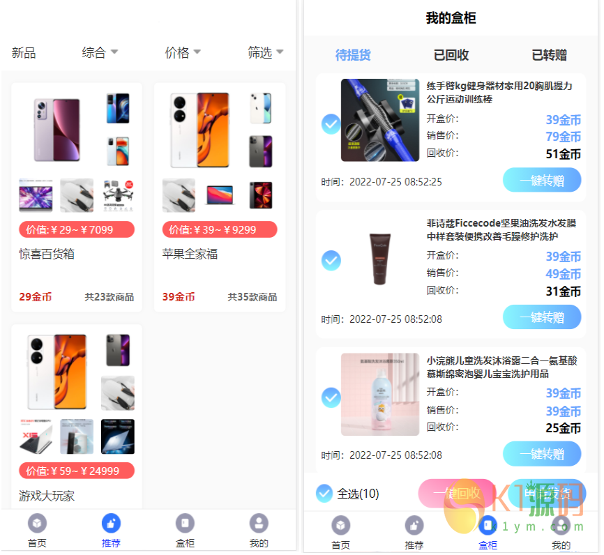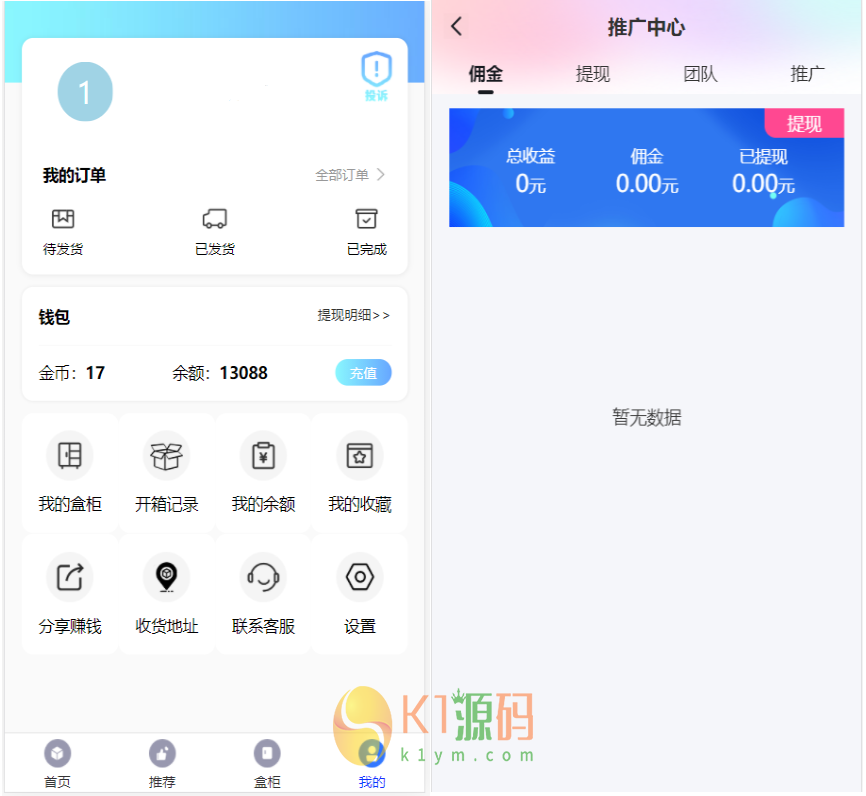 含充值3级分销,盲盒回收成余/额功能/晒图/盲盒转增功能。