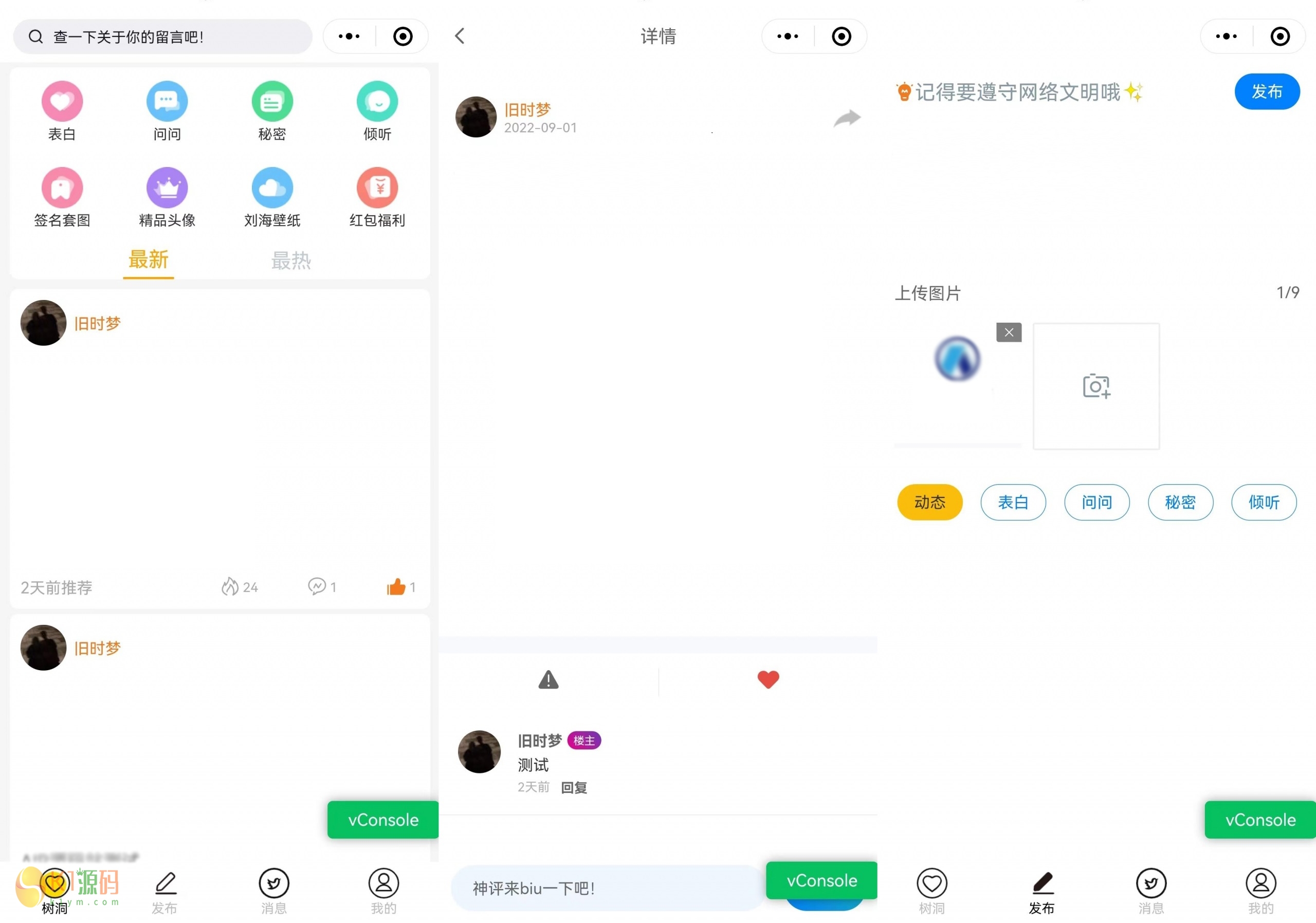 其实这个小程序就看大家怎么使用了 用来做表白墙也可以,做校园社区等等都是可以的 这是从以前旧版本更新UI和修复了登录接口 还有一些原作者以前留下的一些BUG都是修复了的 支持跳转其它小程序,多种分类用户发布等等 UI方面界面小编个人感觉还是挺美观的 其它你们自己研究吧! 声明:本站所有文章,如无特殊说明或标注,均为本站原创发布。任何个人或组织,在未征得本站同意时,禁止复制、盗用、采集、发布本站内容到任何网站、书籍等各类媒体平台。如若本站内容侵犯了原著者的合法权益,可联系我们进行处理。
