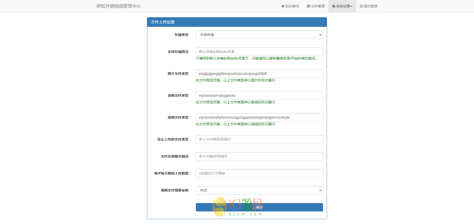 这是一款PHP网盘与外链分享程序,支持所有格式文件的上传,可以生成文件外链、图片外链、音乐视频外链,生成外链同时自动生成相应的UBB代码和HTML代码,还可支持文本、图片、音乐、视频在线预览,这不仅仅是一个网盘,更是一个图床亦或是音乐在线试听网站。新版本增加了图片违规检测,对接阿里云内容安全服务。