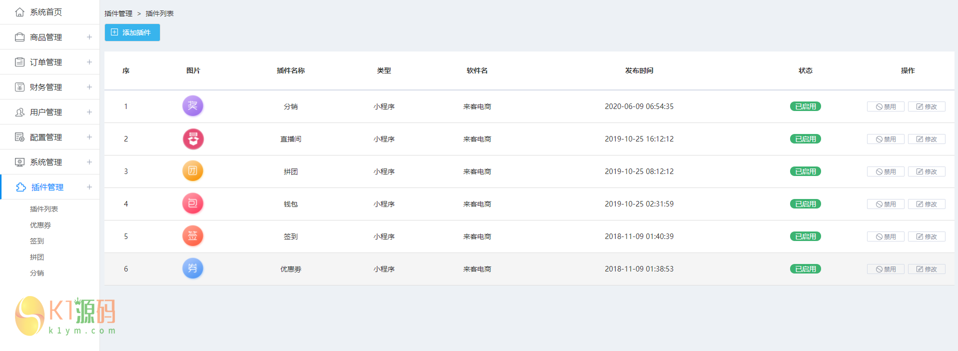 商品管理 商品列表 商品分类 品牌管理 库存管理 订单管理 订单列表 退货商品 财务管理 提现管理 充值管理 余额管理 积分管理 用户管理 用户列表 管理员管理 配置管理 菜单管理 权限管理 充值/提现设置 积分设置 售后地址设置 库存设置 订单设置 运费管理 系统管理 公告管理 文章管理 日志管理 评价管理 推广图设置 热门搜索设置 插件管理 插件列表 优惠券 直播间 签到 拼团 分销