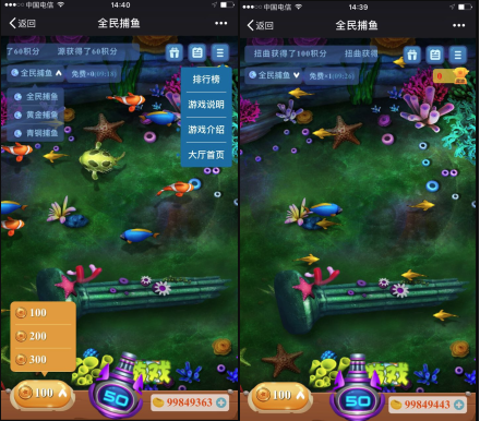 【营销】:首次参与免费赠送粉丝捕鱼机会,机会用完后每10分钟增加一次游戏机会,分享给好友可增加游戏机会,无机会时使用积分捕鱼。