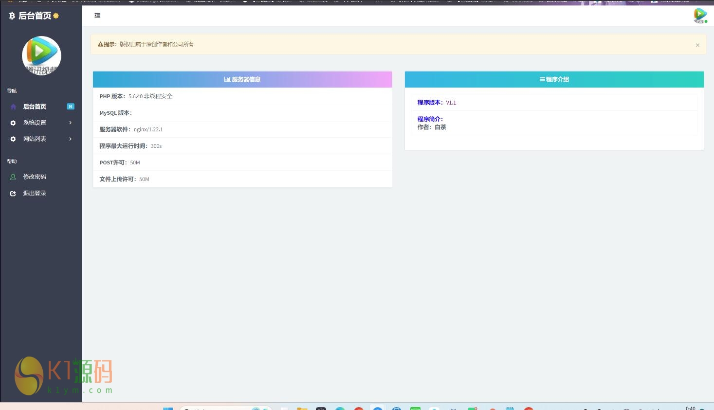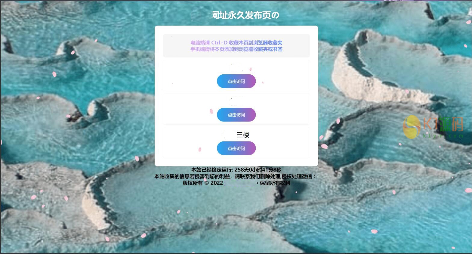 一个带后台的引导页,首页自带樱花飘落! 1.PHP版本请选择5.6! 2.找到config.php修改配置数据库! 3.访问域名输入对应的数据库即可完成安装! 声明:本站所有文章,如无特殊说明或标注,均为本站原创发布。任何个人或组织,在未征得本站同意时,禁止复制、盗用、采集、发布本站内容到任何网站、书籍等各类媒体平台。如若本站内容侵犯了原著者的合法权益,可联系我们进行处理。