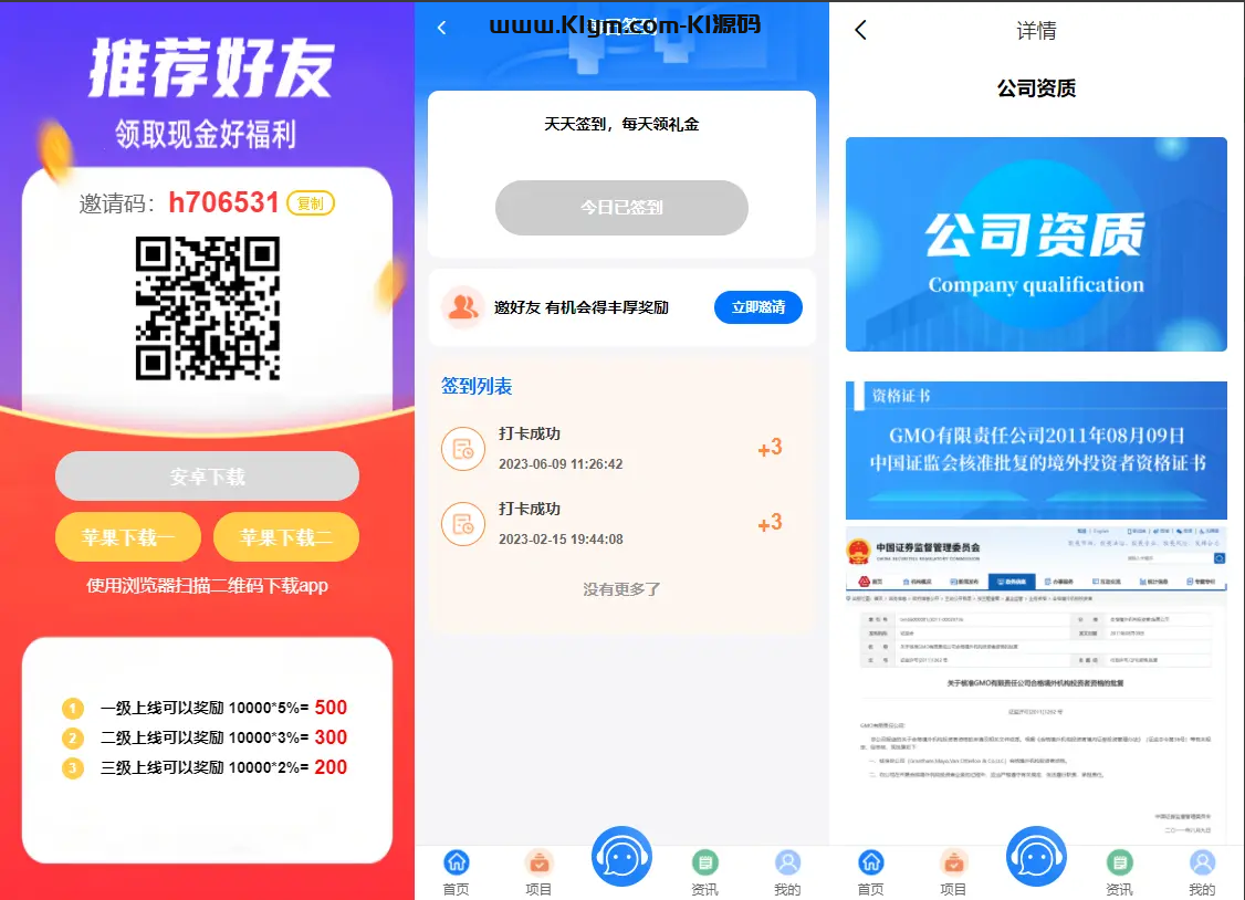 源码前端有vue源码。 基本功能如下: 签到、会员等级、实名认证、团队分销、抽奖、积分商城、日利宝、项目投资等功能! 源码开源无加密授权。 有详细计划任务教程。 声明:本站所有文章,如无特殊说明或标注,均为本站原创发布。任何个人或组织,在未征得本站同意时,禁止复制、盗用、采集、发布本站内容到任何网站、书籍等各类媒体平台。如若本站内容侵犯了原著者的合法权益,可联系我们进行处理。