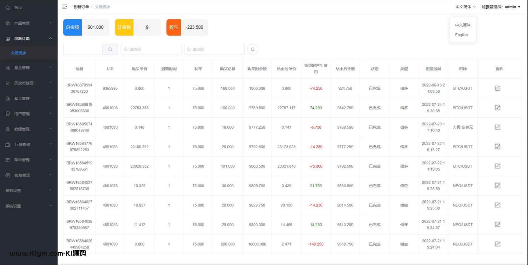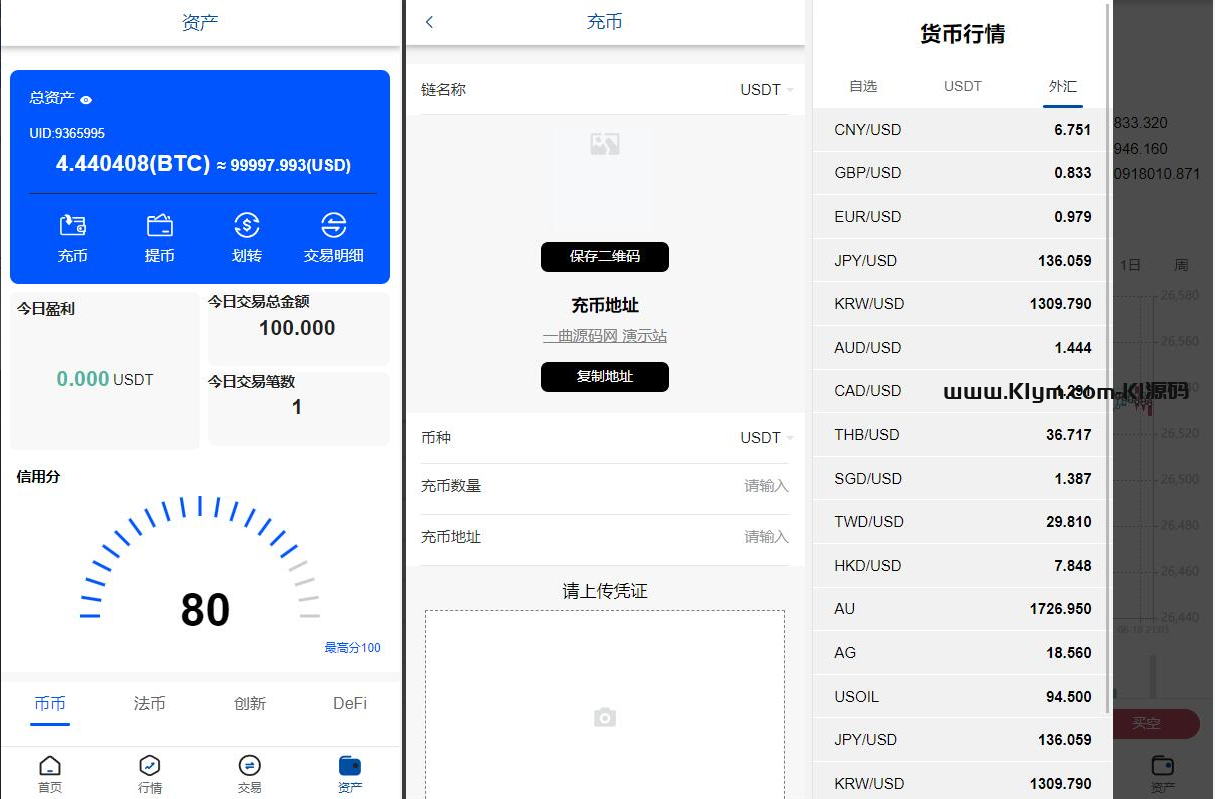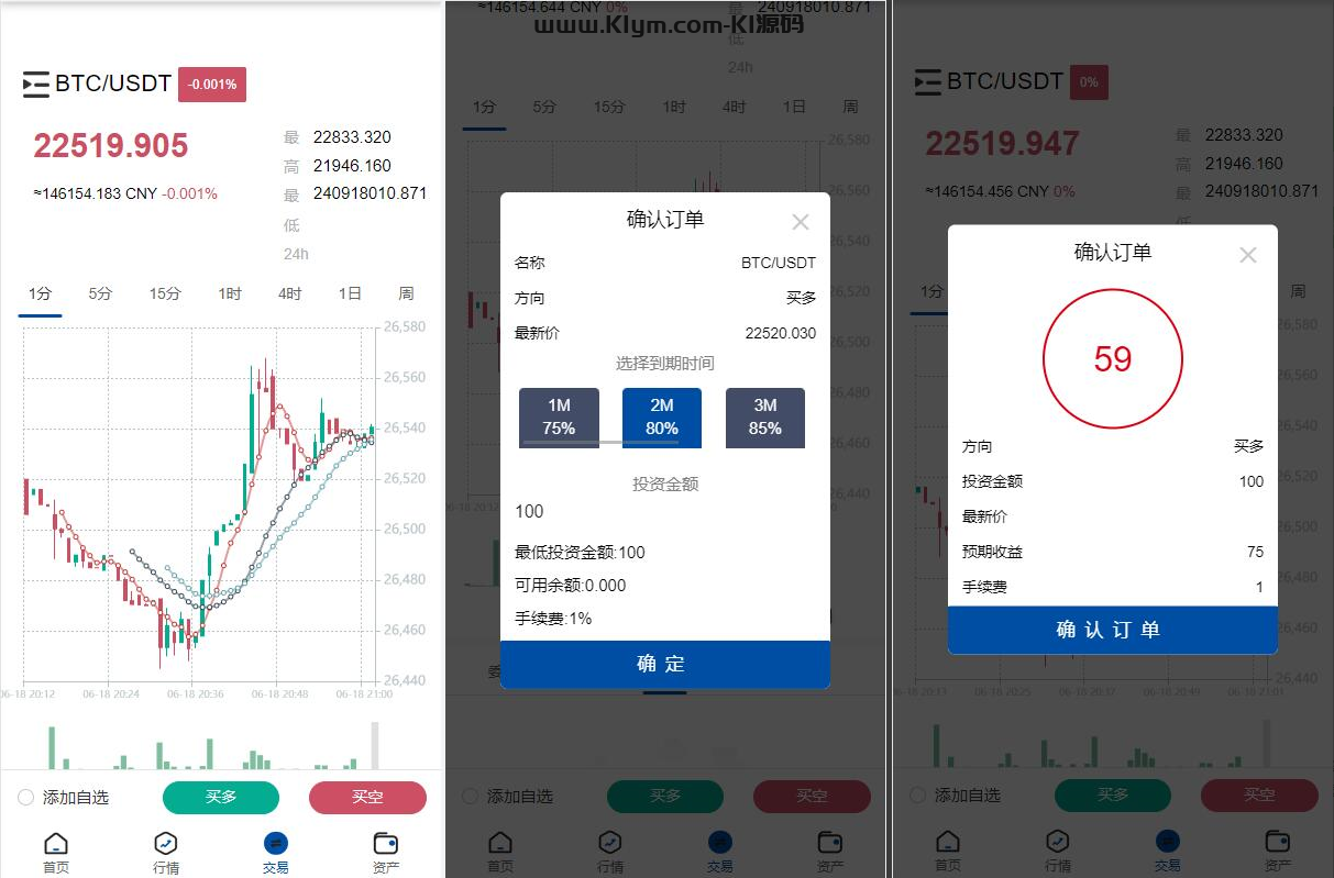 系统前后台都是vue开发的,api端是php的,K线对接付费的阿里云 前端语言︰中文 英语 法语 俄罗斯 语意大利语 西班牙语 后台:中英双语 系统产品: 虚拟币 外汇 黄金 白银 原油 天然气 (可以自行添加) 后台有理财挖矿法币等功能