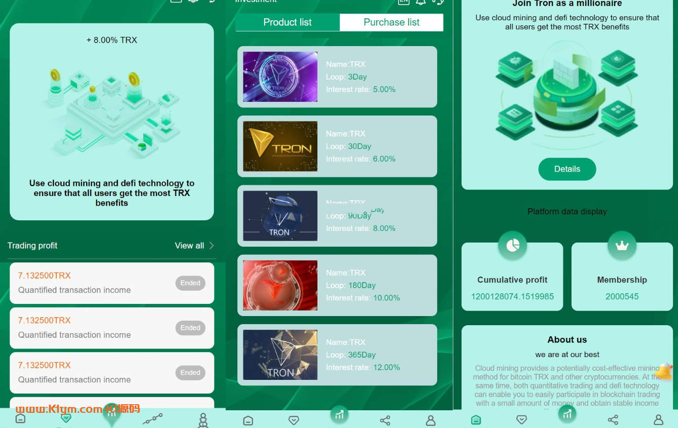 这套是绿色trx理财的那套的开源版 前端vue后端php tp框架 声明:本站所有文章,如无特殊说明或标注,均为本站原创发布。任何个人或组织,在未征得本站同意时,禁止复制、盗用、采集、发布本站内容到任何网站、书籍等各类媒体平台。如若本站内容侵犯了原著者的合法权益,可联系我们进行处理。