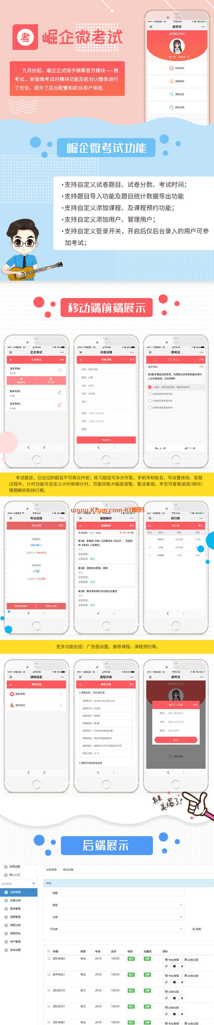 崛企微考试源码V2.7.4,手机端+后,更新动态:版本号:2.7.4 – 老版本增加试卷图片上传修复无法添加关键字回复bug。