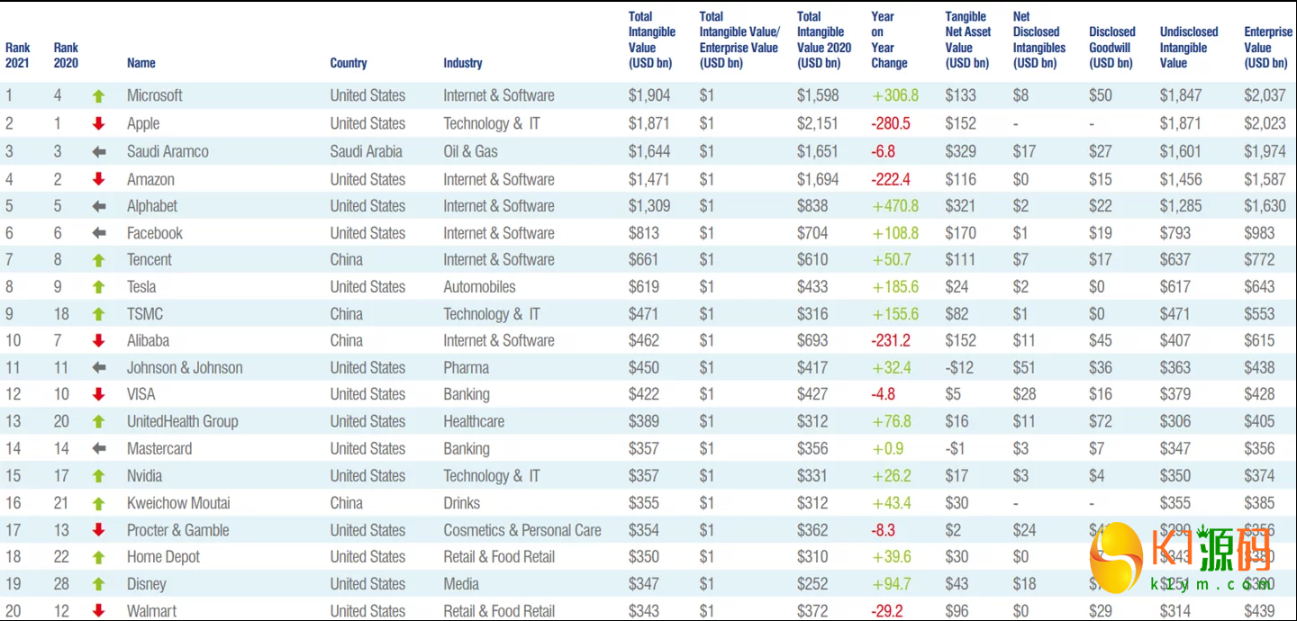 最新数据显示,微软手握近两千万亿美元的无形资产,超越苹果成为世界上第一企业,再其次是沙特阿美、亚马逊、谷歌母公司 Alphabet、Facebook、腾讯、特斯拉、台积电和阿里巴巴,中国企业占据三席。