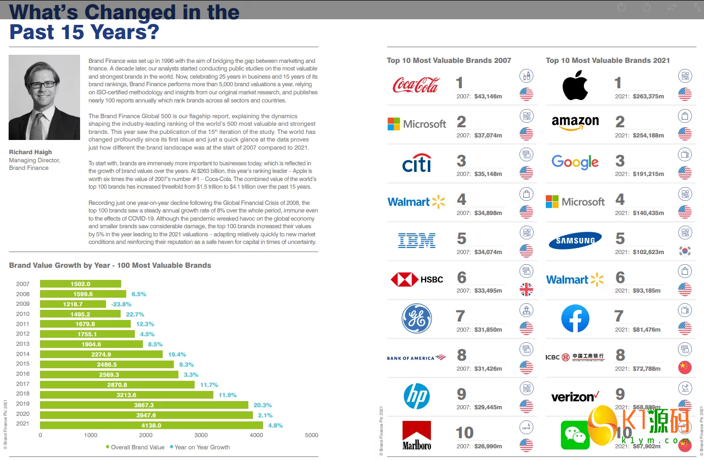 此外,该机构在统一报告中还提出了 2021 世界最具价值的十大品牌,苹果、亚马逊、谷歌、微软、三星、沃尔玛、Facebook、中国工商银行、威瑞森无线、微信分列前十名,相比 2007 年的榜单,前十仅有微软和沃尔玛尚在其中。