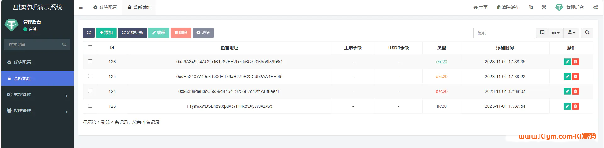 erc,trc,okc,bsc,4链监控地址余额交易源码 不知道干什么用的,用的上的朋友就拍。 声明:本站所有文章,如无特殊说明或标注,均为本站原创发布。任何个人或组织,在未征得本站同意时,禁止复制、盗用、采集、发布本站内容到任何网站、书籍等各类媒体平台。如若本站内容侵犯了原著者的合法权益,可联系我们进行处理。