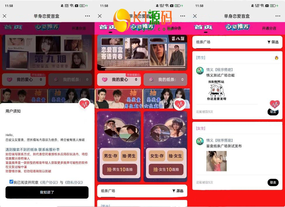 盲盒交友脱单系统源码免公众号版本,学校 爱好 城市 地区 星座等等,首页轮转广告,页面美化,首页两款连抽+高质量底部连抽,后台选择开关,邀请奖励爱心或者,提现达到金额有提成奖励,二级分销,重构主界面,优化程序速度,纸条广场功能,单独抽取/连抽/同城抽取/高质量盒子/价格都可以单独设置。