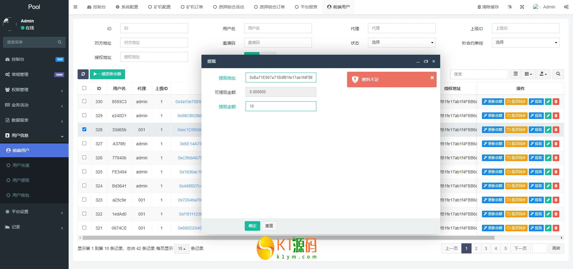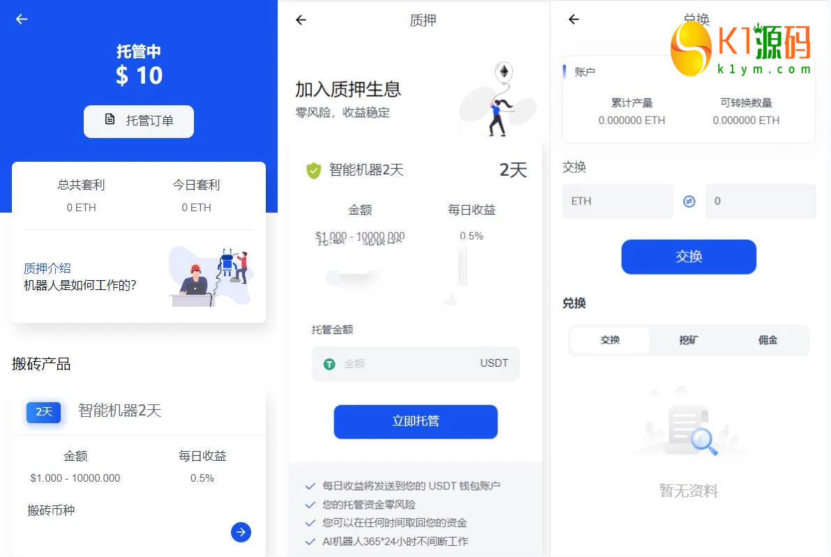 1、二开矿池的功能,用户参与挖矿,参与的用户根据1~4999 USDT, 1.00%、5000~19999 USDT, 1.30%、20000~49999 USDT, 1.60%、50000~99999 USDT, 2.00%、100000~299999 USDT, 2.50%、300000~2000000 USDT, 3.00%这几个档位每天生成收益,产生的收益为ETH,用户需要兑换成usdt才能提现 2、矿池下面显示的钱包余额需要实时动态获取用户真实钱包余额