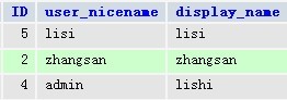 这时将列出你博客上所有的注册用户的ID,昵称和公开显示的名称,你现在就可以找到对应用户的ID了,如下图,zhangsan的ID为2,lisi的ID为5: