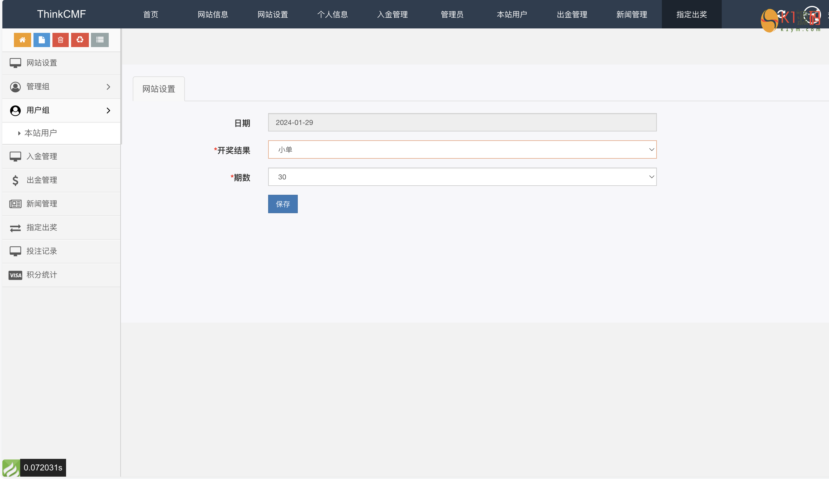 后台可以预设某一期的开奖结果,没有测试这个功能