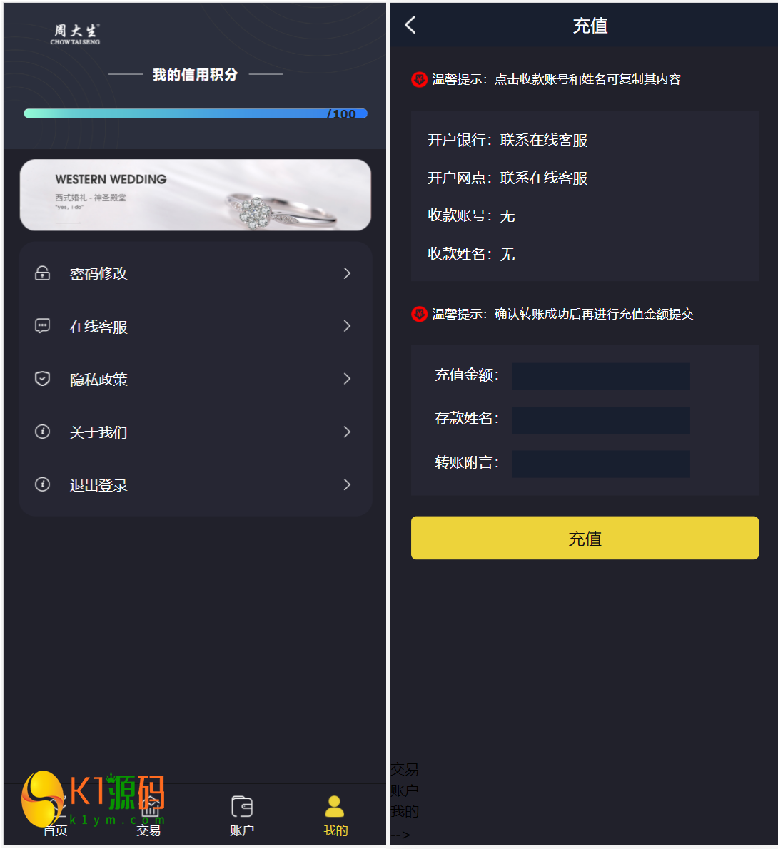 一套二开前端UI得贵金属微交易系统,前端产品后台可任意更换 此系统框架不是以往的至尊的框架,系统完美运行,K线采用nodejs方式运行 K线结算都正常,附带教程 声明:本站所有文章,如无特殊说明或标注,均为本站原创发布。任何个人或组织,在未征得本站同意时,禁止复制、盗用、采集、发布本站内容到任何网站、书籍等各类媒体平台。如若本站内容侵犯了原著者的合法权益,可联系我们进行处理。