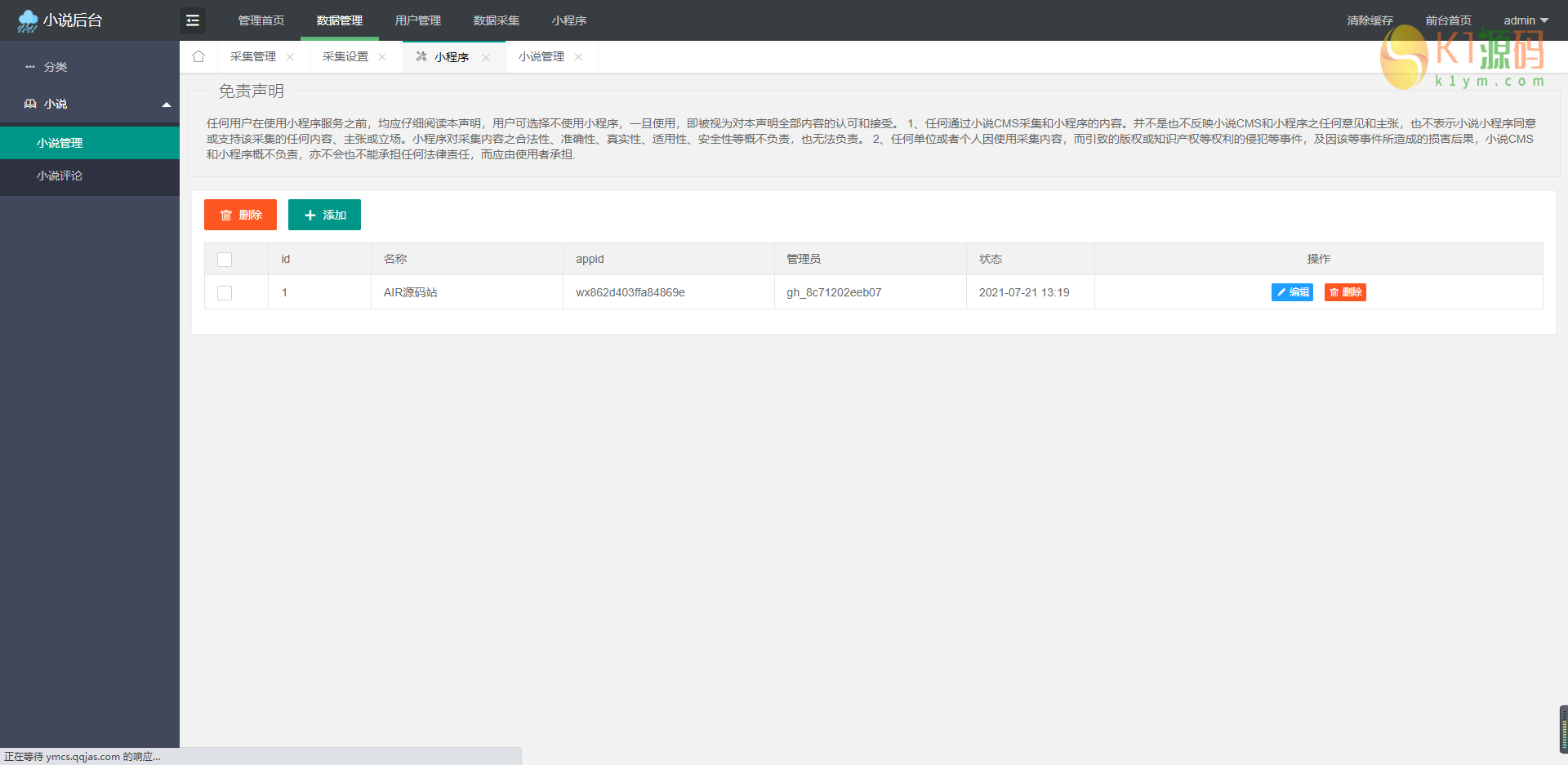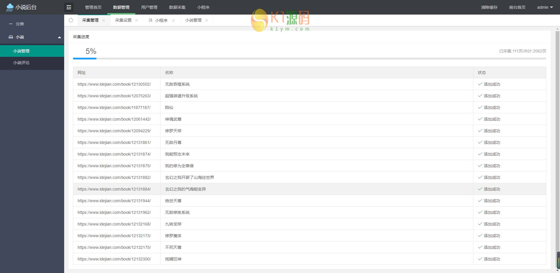 小说的话就点击数据采集然后采集就可以了小程序首页轮播推荐和首页分类显示点击数据管理然后点击小说管理