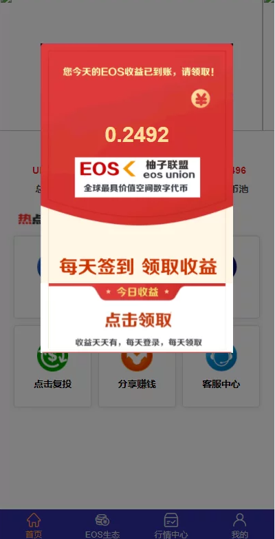 1、注册激活-复投(20个EOS激活:放大5倍资产)复投20个:即100个EOS,静态释放 5‰,每天释放0.5个;复投100个:即500个EOS,静态释放 5‰,每天释放2.5个;复投300个:即1500个EOS,静态释放 5‰,每天释放7.5个;