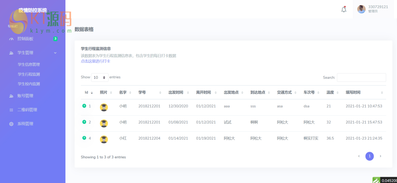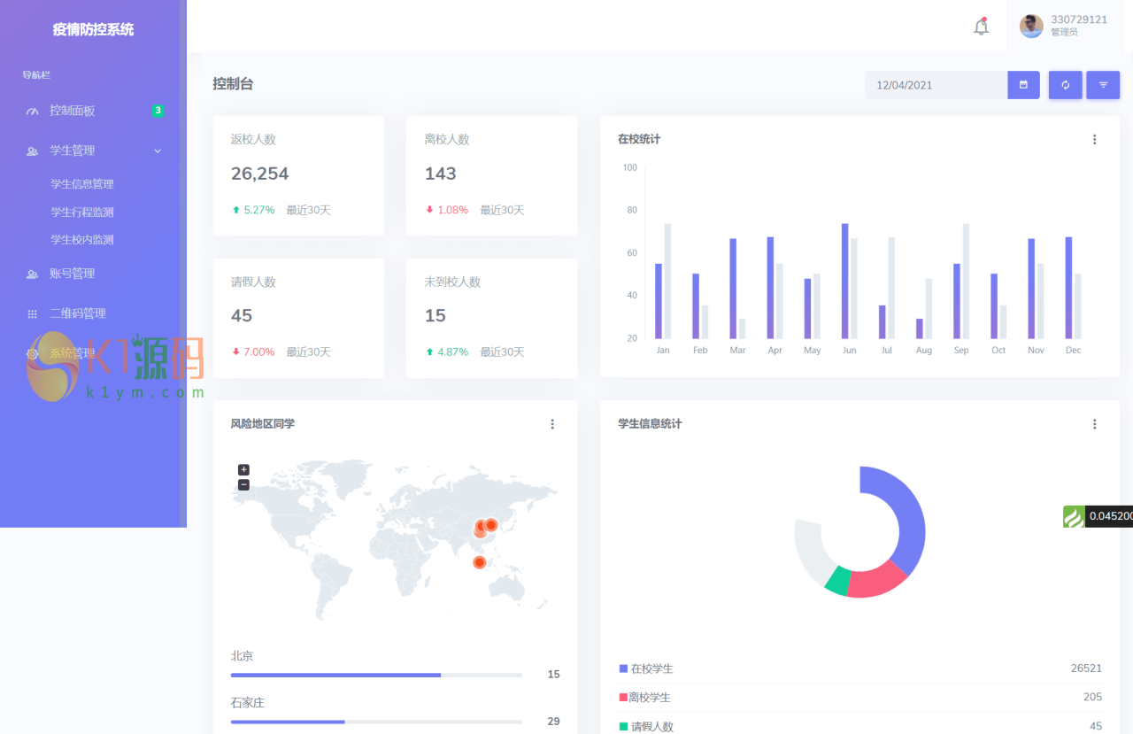 功能包括老师和学生角色权限,大数据图表展示,扫码进出校园,校园行程记录,生成二维码,学生管理,网站管理,学生签到打卡等功能等等。